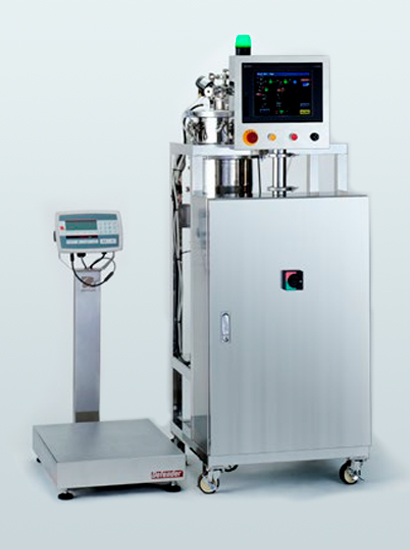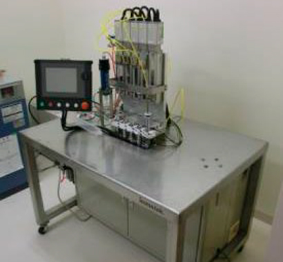充填容器(シリンジなど)をあらかじめ真空脱気し、リニアサーボ高精度位置制御により高精度少量充填が可能。